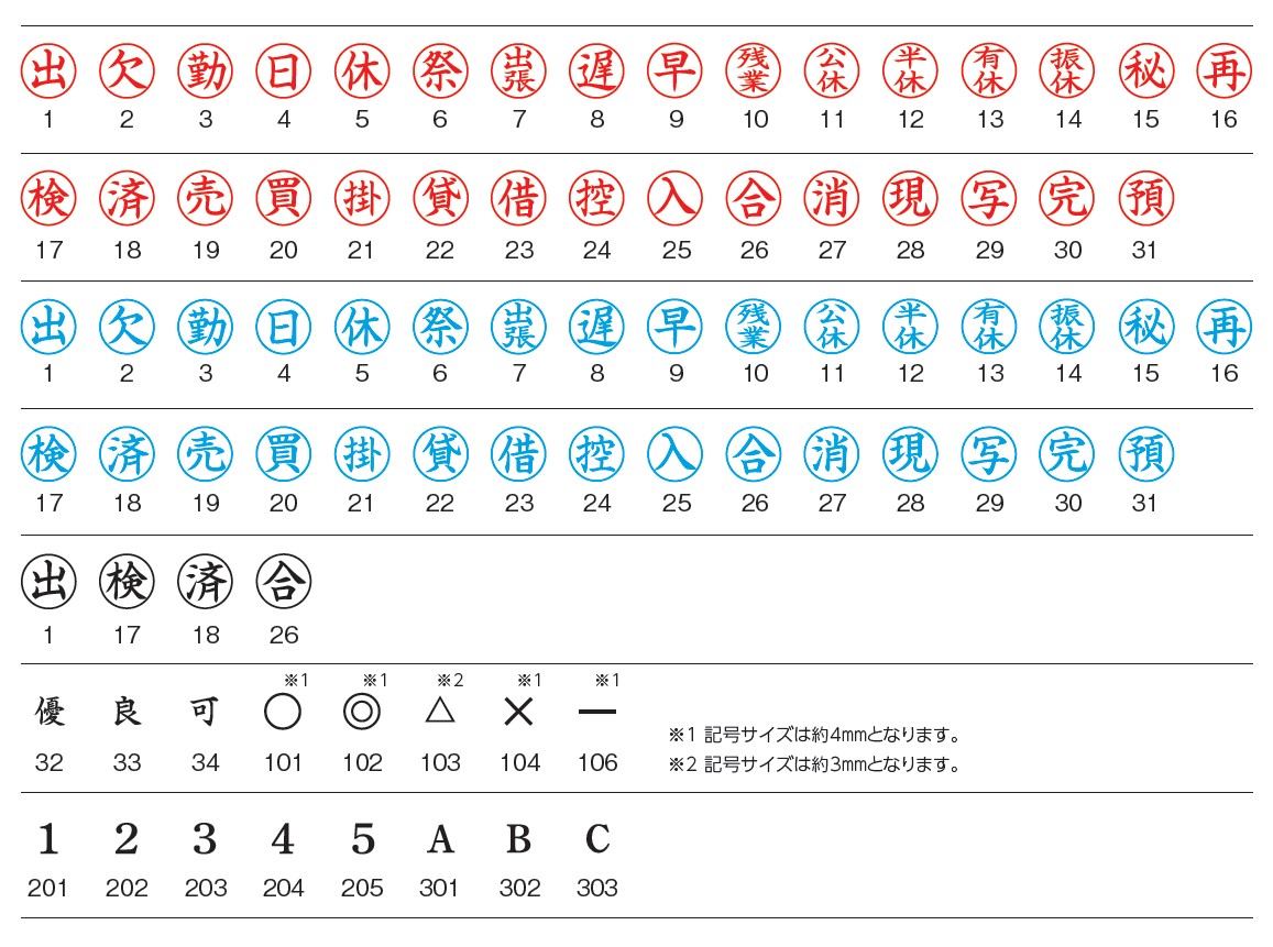 ・帳簿や出席簿などへのなつ印でよく使われる82種類の印面をご用意。