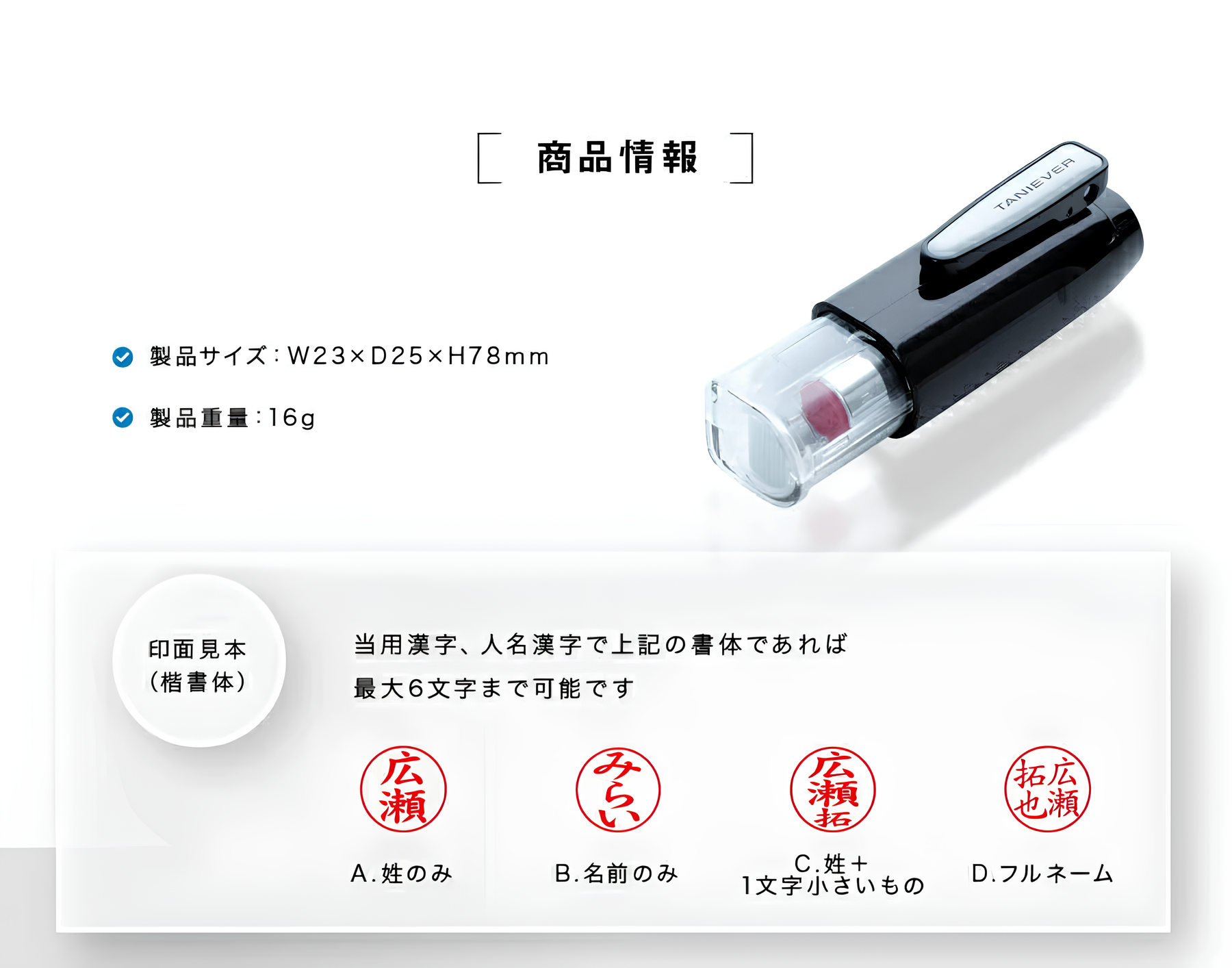 一般的な認印サイズ(9mm)なので、書類や荷受にも使いやすく、日常使いに便利です。